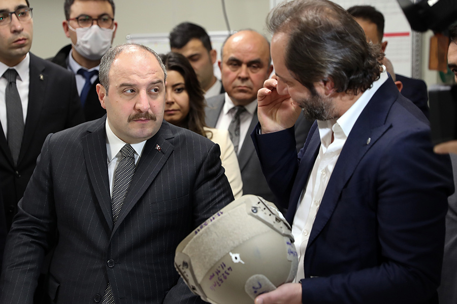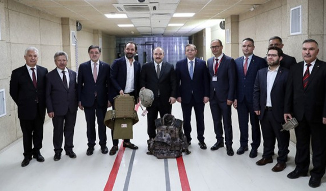 Üretim tesisi içerisindeki test atış tünellerinde 7.62 milimetre balistik mühimmat ile 15 metre mesafeden yelek ve kaska atış yapan Varank, daha sonra ekipmanların atış sonrası durumunu inceledi.