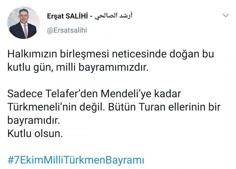 Yıldönümü vesilesiyle yayınladığı mesajda birlik mesajı veren Irak Türkmen Cephesi Başkanı ve Kerkük Milletvekili Erşat Salihi, bugünün sadece Irak Türkmenlerinin değil tüm Türk Dünyasının bayramı olduğunu ifade etti.