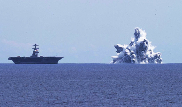 Patlayıcı tatbikatı Atlantik Okyanusu’nda, Uçak gemisi USS Gerald R. Ford seyir halindeyken tamamlandı. ABD Donanması, patlamanın geminin şok sertliğini ölçmek için yapıldığını açıkladı.