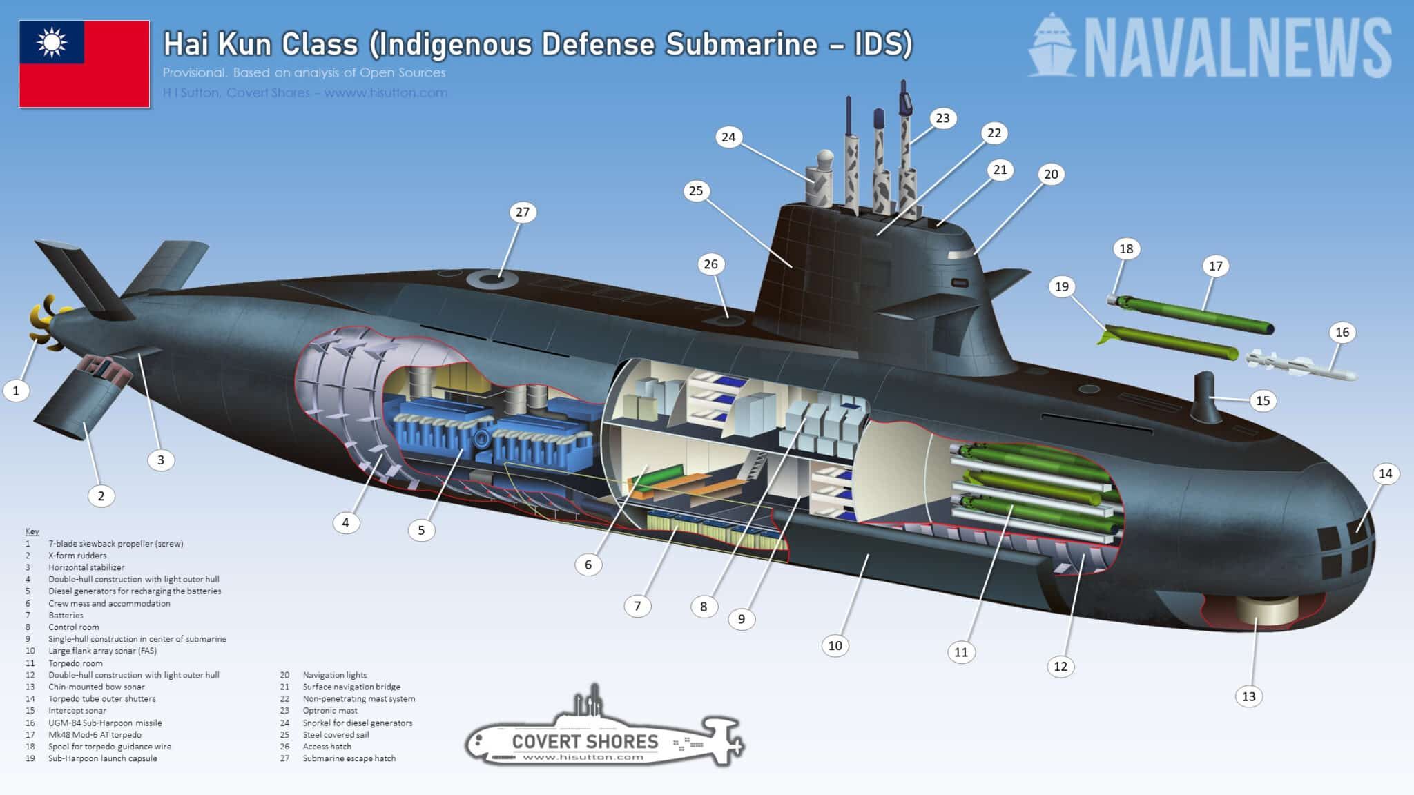 Torpidoların, ABD Donanması’nın meşhur Harpoon gemisavar füzesinin denizaltından fırlatılan versiyonuyla tamamlanması bekleniyor. UGM-84 Sub-Harpoon halihazırda Tayvan’da Hai Lunch-sınıfında hizmet veriyor. Silahların Lockheed Martin tarafından sağlanan bir muharebe yönetim sistemine entegre edilmesiyle daha etkili şekilde kullanılabilmesi hedefleniyor.