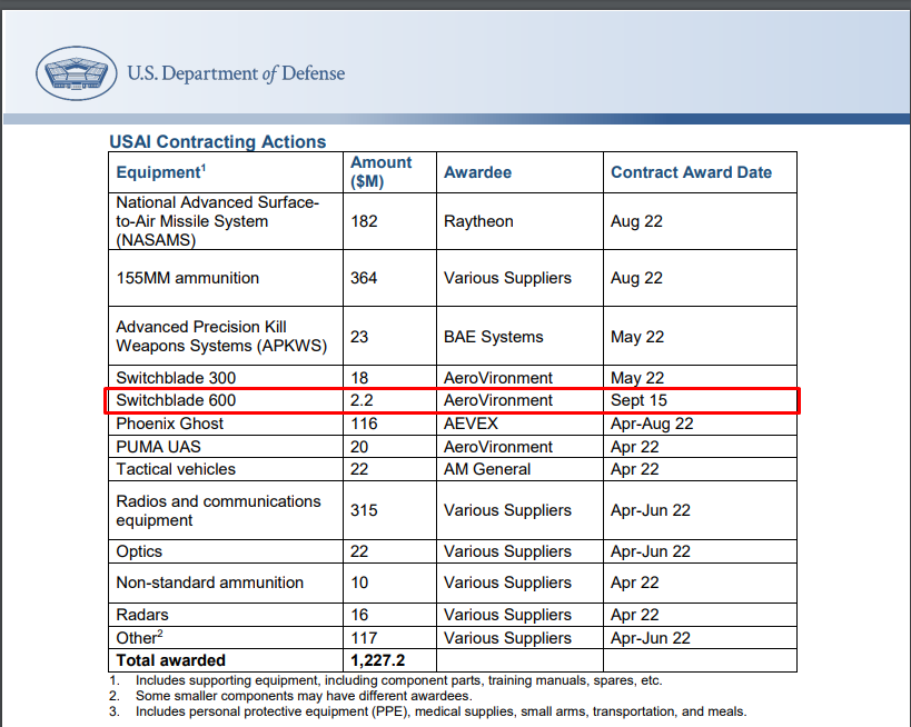 Yayınlanan bir listeye göre, Amerika Birleşik Devletleri Switchblade 300 ve Phoenix Ghost kamikaze İHA da dahil olmak üzere 700 adet Switchblade Taktik İnsansız Hava Aracı teslim etti.