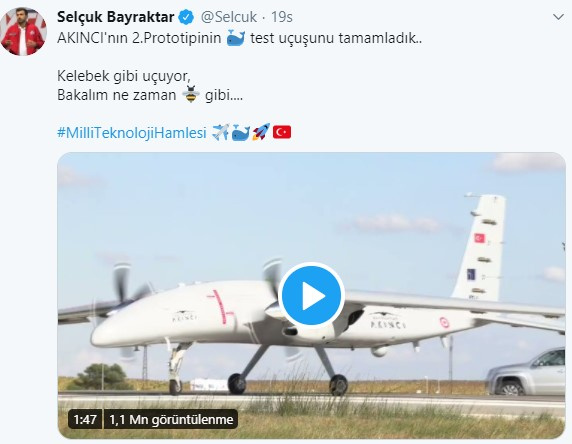 Selçuk Bayraktar yapmış olduğu paylaşımda Akıncı için “kelebek gibi uçuyor” ifadesi takipçileri tarafından oldukça ilgi gördü.