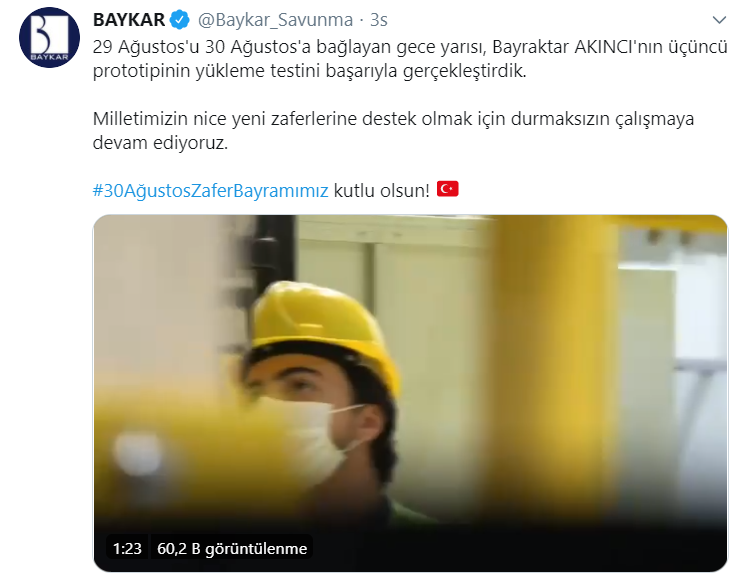Baykar resmi twitter hesabı üzerinden yapılan paylaşımda; “29 Ağustos’u 30 Ağustos’a bağlayan gece yarısı, Bayraktar AKINCI’nın üçüncü prototipinin yükleme testini başarıyla gerçekleştirdik. Milletimizin nice yeni zaferlerine destek olmak için durmaksızın çalışmaya devam ediyoruz.” ifadeleri kullanıldı.