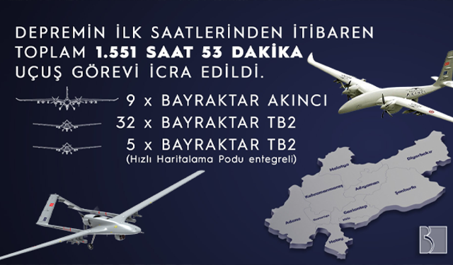 BAYKAR, 9 adet Bayraktar AKINCI ve 37 adet Bayraktar TB2’nin depremin ilk gününden bu yana afet bölgesinde toplamda 1.551 saat 53 dakika görev uçuşu icra ettiğini duyurdu.