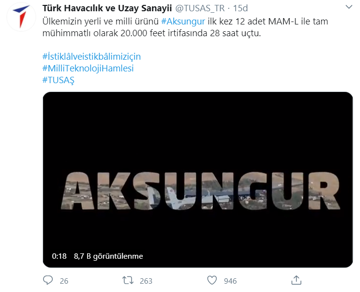 Türk Havacılık ve Uzay Sanayii’nin (TUSAŞ) resmi twitter hesabından yaptığı paylaşımda; “Ülkemizin yerli ve milli ürünü #Aksungur ilk kez 12 adet MAM-L ile tam mühimmatlı olarak 20.000 feet irtifasında 28 saat uçtu. İstiklâl ve istikbâlimiz için MilliTeknolojiHamlesi TUSAŞ” ifadelerini kullandı.
