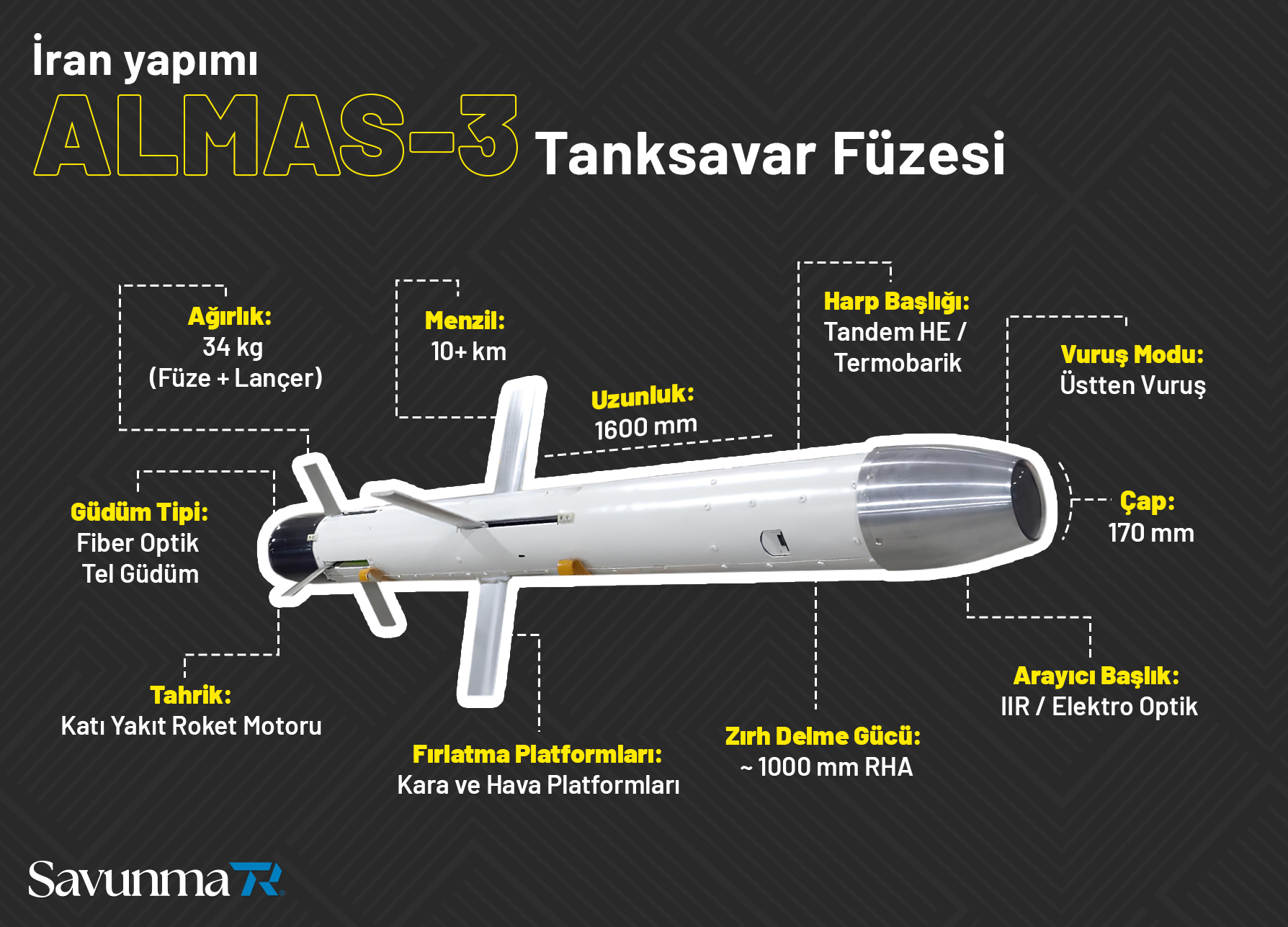 Spike-ER II füzesi üzerinden tersine mühendislik yöntemi ile geliştirildiği tahmin edilen Almas-3 tanksavar füzesi 10 km’nin üstündeki menziliyle uzak mesafeden hassas saldırı imkânı sunuyor. Elektro-optik gündüz kamerası ve görüntüleyici kızılötesi (IIR) arayıcısı bulunduğu belirtilen füze fiber optik kablo vasıtasıyla kullanıcı tarafından füze lançer üzerinden yönlendirilmektedir.