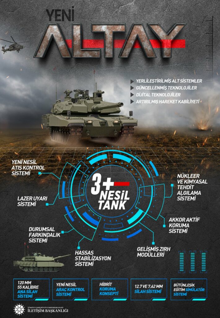 Modern kabiliyetler ve milli alt sistemler ile yeniden tasarlanan Altay, barındırdığı teknolojiler ile 3+ Nesil tank olarak Türk Silahlı Kuvvetlerine güç verecek. Roketsan üretimi hafif ancak dayanıklı üstün teknoloji zırh, Aselsan üretimi aktif koruma sistemi AKKOR, modern atış kontrol sistemleri ve optik sistemler ve daha birçok yeni teknoloji sistemle donatılmış Yeni Altay, esnek bir mimariyle güncel teknolojiyle modernize edilebilecek şekilde geliştirildi.