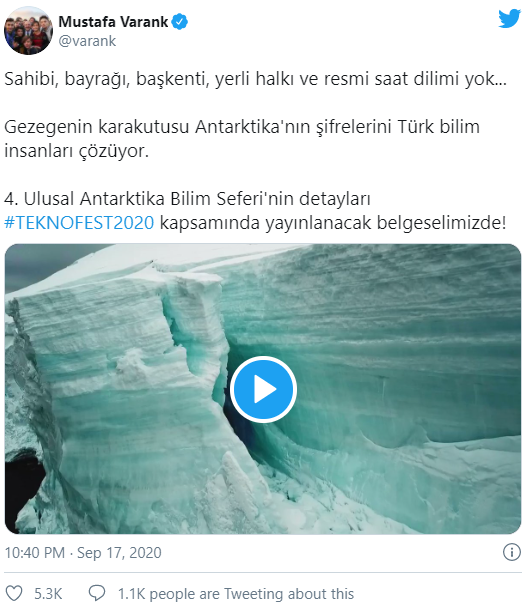 Paylaşımında “Beyaz Kıta” için “Sahibi, bayrağı, başkenti, yerli halkı ve resmi saat dilimi yok. Gezegenin karakutusu Antarktika’nın şifrelerini Türk bilim insanları çözüyor.” değerlendirmesinde bulunan Varank, 4’üncü Ulusal Antarktika Bilim Seferi’nin detaylarının Teknofest 2020 kapsamında yayınlanacak belgeselde yer alacağını duyurdu.