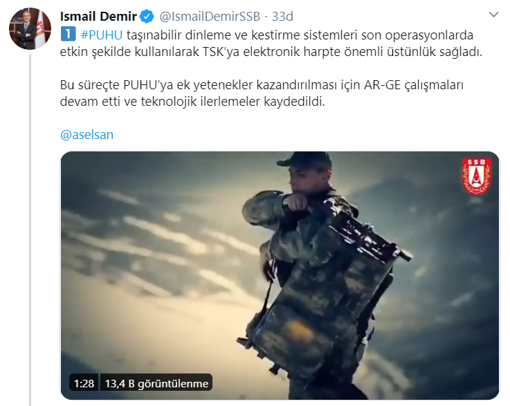 Savunma Sanayii Başkanı Prof. Dr. İsmail Demir, resmi Twitter hesabından yaptığı paylaşımda; “PUHU taşınabilir dinleme ve kestirme sistemleri son operasyonlarda etkin şekilde kullanılarak TSK’ya elektronik harpte önemli üstünlük sağladı. Bu süreçte PUHU’ya ek yetenekler kazandırılması için AR-GE çalışmaları devam etti ve teknolojik ilerlemeler kaydedildi.