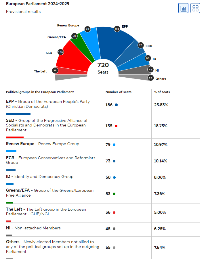 EPP’yi, 135 milletvekili ile Sosyalistler ve Demokratlar İlerici İttifakı (S&D) ve 79 milletvekili ile Yenileme Avrupası (RE) takip ediyor. Aşırı sağcı partilerden Avrupa Muhafazakarları ve Reformistler (ECR) 73, Kimlik ve Demokrasi (ID) ise 58 sandalye ile ilk beşte yer alıyor. Yeşiller grubu 53, Sol ise 36 sandalye kazanmış durumda.
