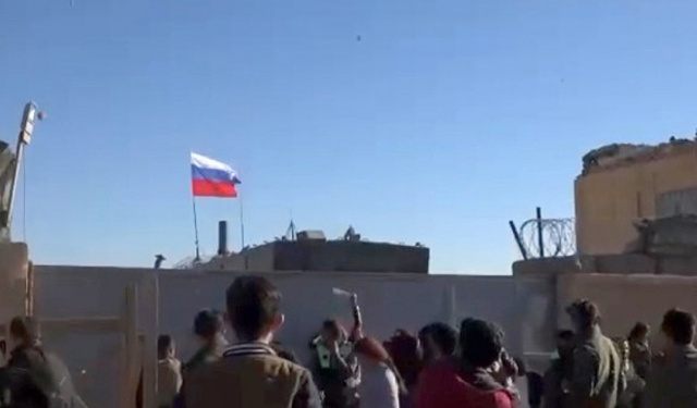 Terör örgütü flamaları ve terörist elebaşı Abdullah Öcalan resimleri taşıyan kalabalığa Rus askerleri müdahalede bulunmadı.