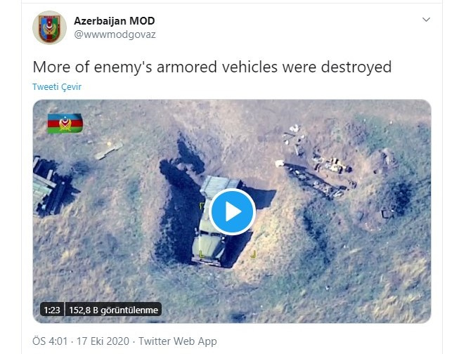 Azerbaycan Savunma Bakanlığı, Ermenistan ordusuna ait askeri araçların imha görüntülerini resmi Twitter hesabından paylaştı.