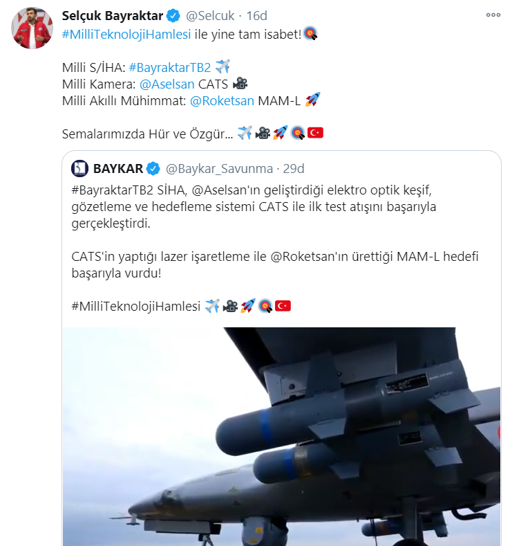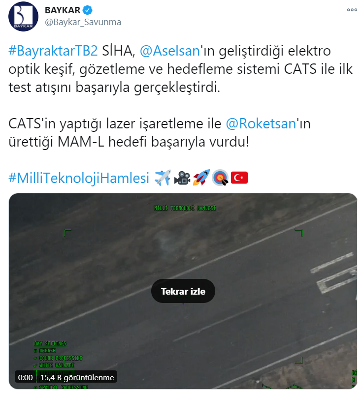 BAYKAR resmi twitter hesabından yapılan açıklamada, “Bayraktar TB2 SİHA, Aselsan’ın geliştirdiği elektro optik keşif, gözetleme ve hedefleme sistemi CATS ile ilk test atışını başarıyla gerçekleştirdi. CATS’in yaptığı lazer işaretleme ile Roketsan’ın ürettiği MAM-L hedefi başarıyla vurdu!” ifadelerine yer verildi.