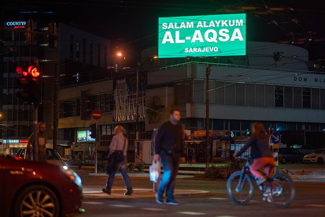Uluslararası Demokratlar Birliği (UID) Bosna Hersek Temsilciliği tarafından başkentteki reklam panolarına yansıtılan “Selamün Aleyküm Mescid-i Aksa” yazılı mesajla Saraybosnalıların Filistinlilerin yanında olduğu ifade edildi.