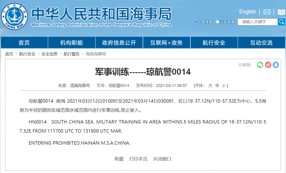 Çin Hainan Deniz Güvenliği İdaresi tarafından yayınlanan bir bildiride Çin Halk Kurtuluş Ordusunun 12-14 Mart tarihlerinde Güney Çin Denizi bölgesindeki sularda askeri tatbikat düzenleyeceği duyuruldu.