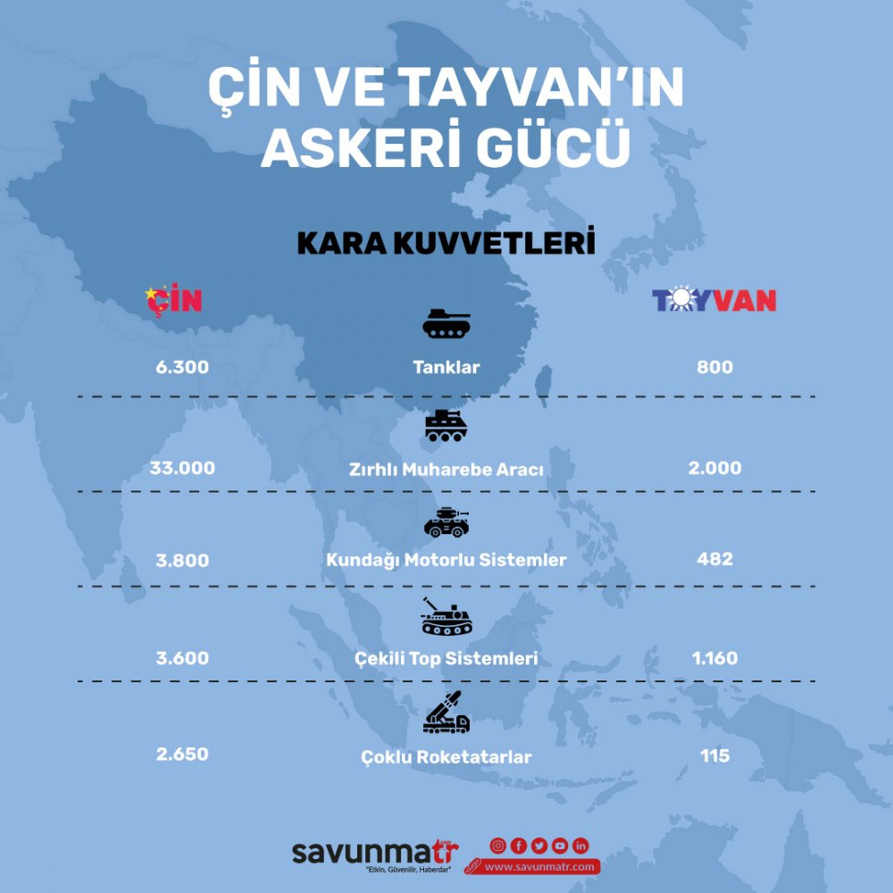 Olası bir Çin-Tayvan kara muharebesinde ise iki ordunun kara gücü şu şekilde: