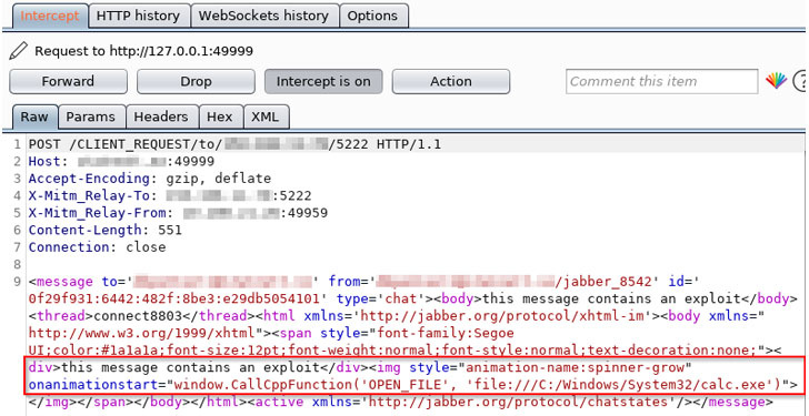 XMPP üzerinde gönderilen HTML kodlarının kontrol olmadan çalıştığı aktarıldı. Bununla ilgili de aşağıdaki görsel paylaşıldı. Bu nedenle hedef bilgisayarlarda zararlı .exe uygulamalarının çalıştırılabileceği belirtildi.