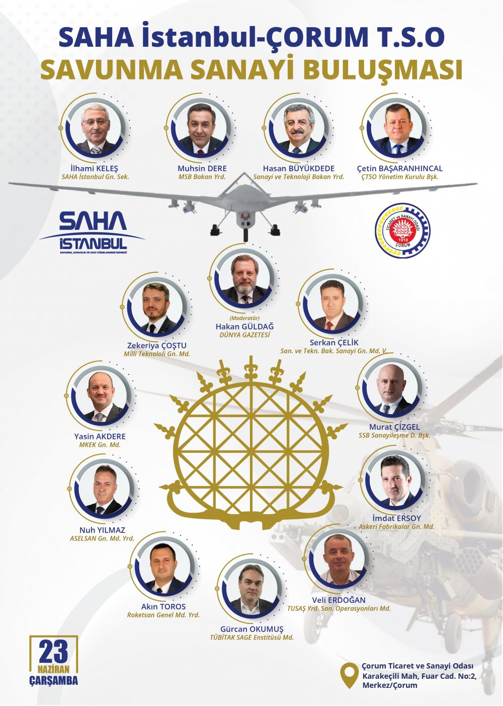 Dünya Gazetesi Genel Yayın Yönetmeni Hakan Güldağ’ın moderatörlüğünde gerçekleştirilecek panellerde; Çorum Sanayi Odası Başkanı Çetin Başaran Hıncal, Savunma Sanayi Başkanlığı Sanayileşme Daire Başkanı Murat Çizgel, Sanayi ve Teknoloji Bakanlığı Milli Teknoloji Genel Müdür Zekeriya Coştu, Sanayi ve Teknoloji Bakanlığı Sanayi Genel Müdür Vekili Serkan Çelik, Makina Kimya Endüstrisi Genel Müdürü Yasin Akdere, Milli Savunma Bakanlığı Askeri Fabrikalar Genel Müdürü İmdat Ersoy, ASELSAN Tedarik Zinciri Yönetimi Genel Müdür Yardımcısı Nuh Yılmaz, TAİ-TUSAŞ Tedarik ve Sanayileşme Müdürü Veli Erdoğan, Roketsan Tedarik’ten Sorumlu Genel Müdür Yardımcısı Akın Toros, TÜBİTAK SAGE Genel Müdürü Gürcan Okumuş konuşmalarıyla yer alacak.