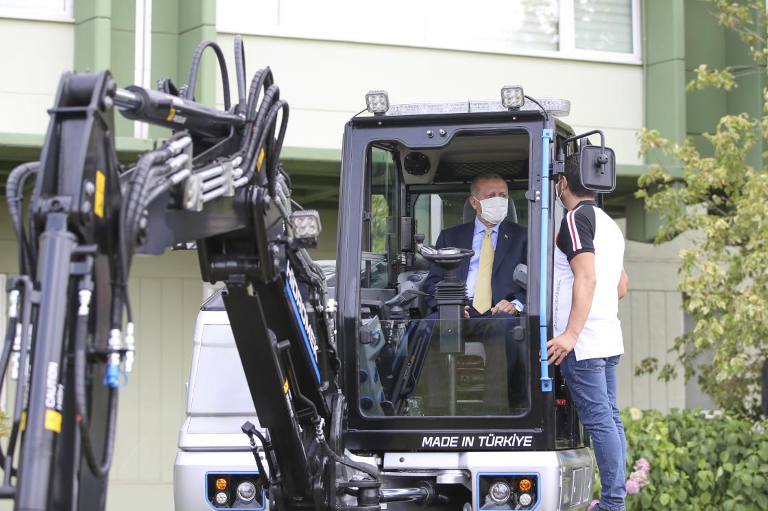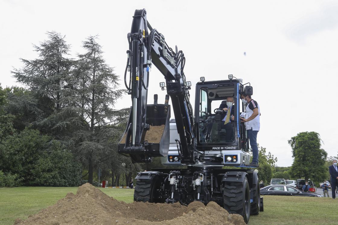 Yerli üretim ekskavatörü inceleyen Erdoğan, tören alanına yakın alanda kullandığı araçla toprak attı.