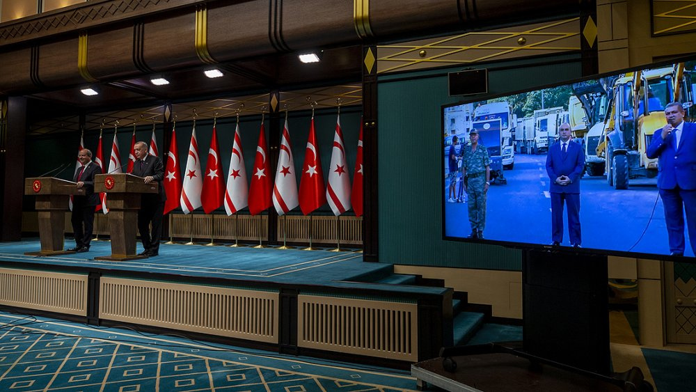 Cumhurbaşkanı Recep Tayyip Erdoğan, Cumhurbaşkanlığı Külliyesi’nde KKTC Başbakanı Ersin Tatar’ı kabulünün ardından açıklamalarda bulundu, Tatar ile “KKTC Su Temin Projesi Boru Hattı Onarımını Müteakip Su Verme Merasimi”ne video konferansla bağlandı.