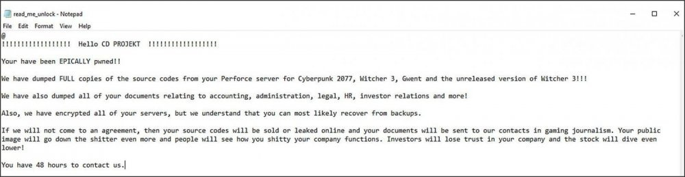 Fidye yazılımı sonrasında ele geçirilen oyunun kaynak kodunun satılmış olabileceği haberi geldi. Oyun firmasının ağına sızan hackerların Cyberpunk 2077, Witcher 3, Gwent ve Witcher 3’ün yayınlanmamış bir versiyonunu çaldı. Bununla birlikte firmanın yönetim, muhasebe, insan kaynakları ve yatırımcı ilişkilerine dair belgeleri çalındığı belirtildi.