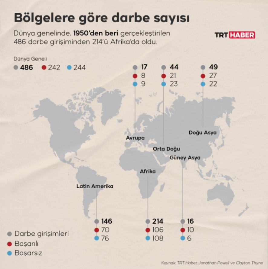 Clayton Thyne ve Jonathan Powell’ın darbe veri setine göre, 1950 ile 2010 yılları arasında toplamda 486 darbe girişimi kaydedilmiştir. Bu girişimlerin 242’si başarıya ulaşırken, 244’ü başarısızlıkla sonuçlanmıştır. Darbelerin en sık görüldüğü bölgeler Afrika (%44,03) ve Amerika (%30,04) kıtalarıdır. Asya ve Orta Doğu ise sırasıyla %13,79 ve %9,05 oranlarıyla toplam küresel darbelerde daha az paya sahiptir. Avrupa ise sadece %3,50 ile darbelerin en az yaşandığı bölge olmuştur.