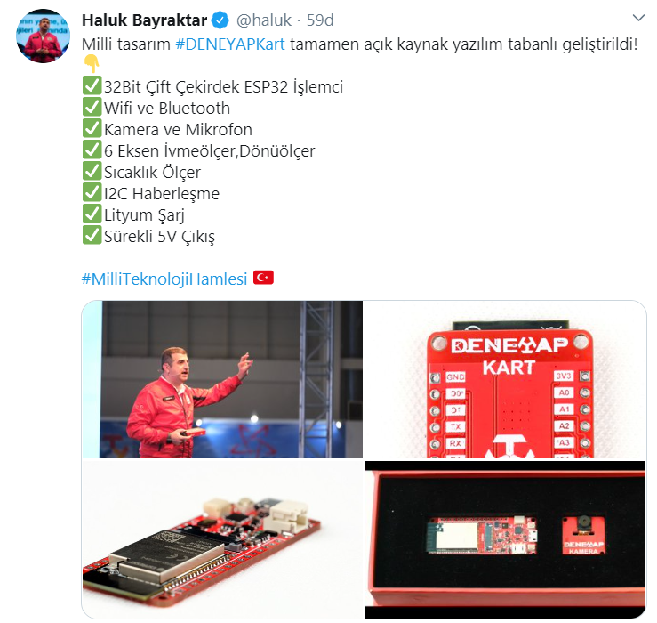 BAYKAR Genel Müdürü Haluk Bayraktar resmi twitter hesabından yaptığı paylaşımda, “Milli tasarım #DENEYAPKart tamamen açık kaynak yazılım tabanlı geliştirildi! 32Bit Çift Çekirdek ESP32 İşlemci, Wifi ve Bluetooth, Kamera ve Mikrofon, 6 Eksen İvmeölçer, Dönüölçer, Sıcaklık Ölçer, I2C Haberleşme, Lityum Şarj, Sürekli 5V Çıkış.” ifadelerini kullandı ve yerli Deneyap tasarımının öne çıkan özelliklerine de yer vererek tanıtımını yaptı.