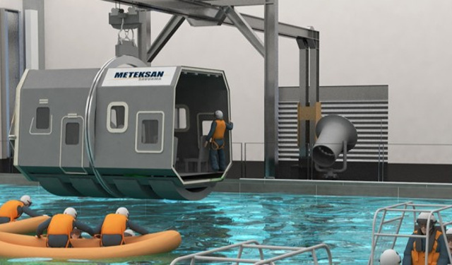 Gemiyi terk etme eğitimlerinin ve kazazedelerin gemi güvertesine alınması eğitimlerinin verileceği platform, file merdiven sistemi, halat, kapalı can salı ve atma mekanizması ile teçhiz edildi.