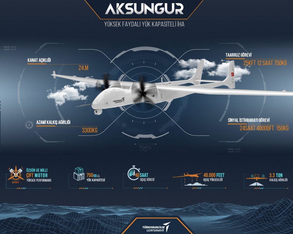 Yüksek faydalı yük kapasiteli İHA, kesintisiz çok rollü istihbarat, gözetleme, keşif ve taarruz görevleri için ANKA-AKSUNGUR İHA sistemi; gündüz/gece istihbarat, gözetleme, keşif ve taarruz görevleri’ni EO/IR, SAR ve SIGINT faydalı yükleri ve çeşitli havadan yere silahlarla icra edebilir. ANKA-AKSUNGUR 40 bin feet’e kadar uzun süreli operasyonlara imkan veren iki adet çift turboşarjlı dizel PD-170 motoruna sahip olması dikkat çekiyor.