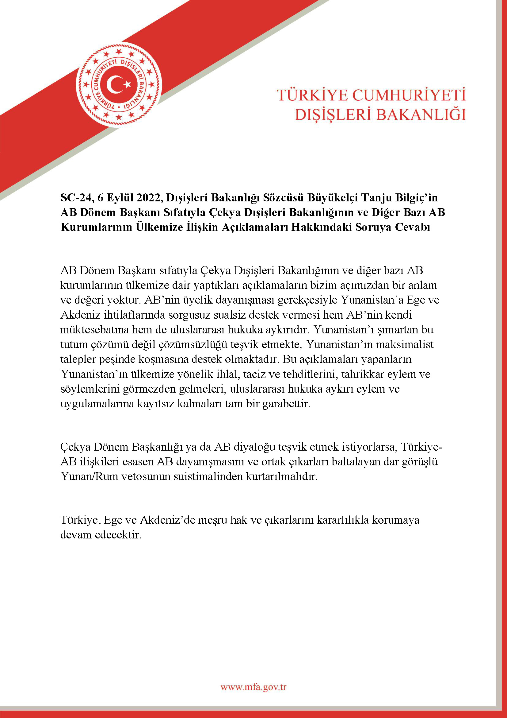 “AB Dönem Başkanı sıfatıyla Çekya Dışişleri Bakanlığının ve diğer bazı AB kurumlarının ülkemize dair yaptıkları açıklamaların bizim açımızdan bir anlam ve değeri yoktur. AB’nin üyelik dayanışması gerekçesiyle Yunanistan’a Ege ve Akdeniz ihtilaflarında sorgusuz sualsiz destek vermesi hem AB’nin kendi müktesebatına hem de uluslararası hukuka aykırıdır. Yunanistan’ı şımartan bu tutum çözümü değil çözümsüzlüğü teşvik etmekte, Yunanistan’ın maksimalist talepler peşinde koşmasına destek olmaktadır. Bu açıklamaları yapanların Yunanistan’ın ülkemize yönelik ihlal, taciz ve tehditlerini, tahrikkar eylem ve söylemlerini görmezden gelmeleri, uluslararası hukuka aykırı eylem ve uygulamalarına kayıtsız kalmaları tam bir garabettir.”