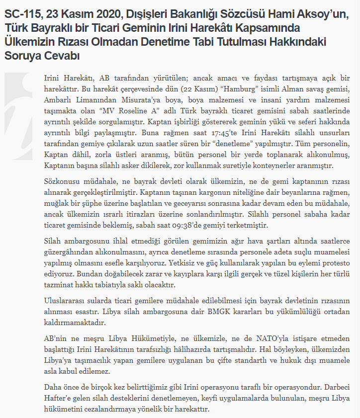 Dışişleri Bakanlığı’ndan yapılan “Türk Bayraklı bir Ticari Geminin Irini Harekâtı Kapsamında Ülkemizin Rızası Olmadan Denetime Tabi Tutulması Hakkındaki Soruya Cevabı” başlıklı yazılı açıklamada;