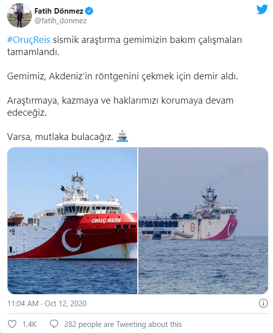Enerji ve Tabii Kaynaklar Bakanı Fatih Dönmez, Twitter hesabından yaptığı paylaşımda, “Oruç Reis sismik araştırma gemimizin bakım çalışmaları tamamlandı. Gemimiz, Akdeniz’in röntgenini çekmek için demir aldı. Araştırmaya, kazmaya ve haklarımızı korumaya devam edeceğiz. Varsa mutlaka bulacağız.” değerlendirmesinde bulundu.