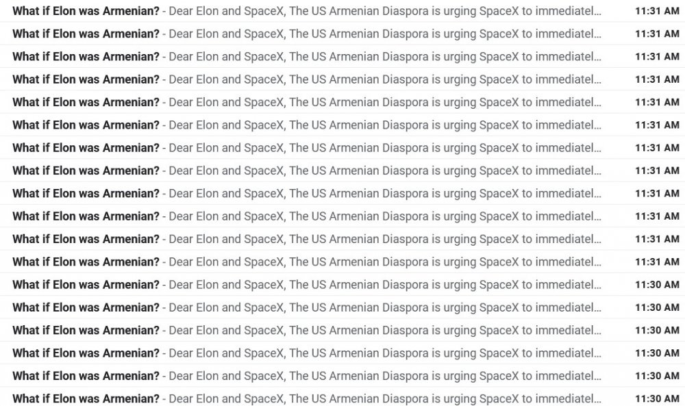 Gönderilen iletilerin içeriği bilinmiyor olsa da ortaya çıkan posta listesinde görülen konu bile oldukça saçma görünüyor. “ Ya Elon Ermeni olsaydı ?” anlamına gelen What if Elon was Armenian? başlığı ile gönderilen postanın ilk cümlesinin bir kısmı da görüntüleniyor.