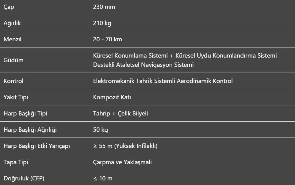 TRG-230 füzesinin teknik özellikleri ise şu şekilde;