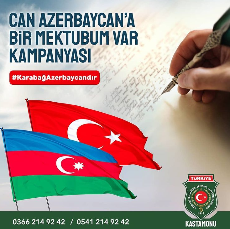 Kampanyayla Türkiye’nin 81 ilinden gelecek mektuplar Karabağ’ı işgalden kurtaran muzaffer Azerbaycan ordusunun kahraman askerlerine ulaştırılacak. Mektup göndermek isteyenler 15 Aralık’a kadar derneğin Hepkebirler Mah. İnönü Cad. No:14/A -KASTAMONU/MERKEZ adresine veya [email protected] mail adresine gönderebilecekler.