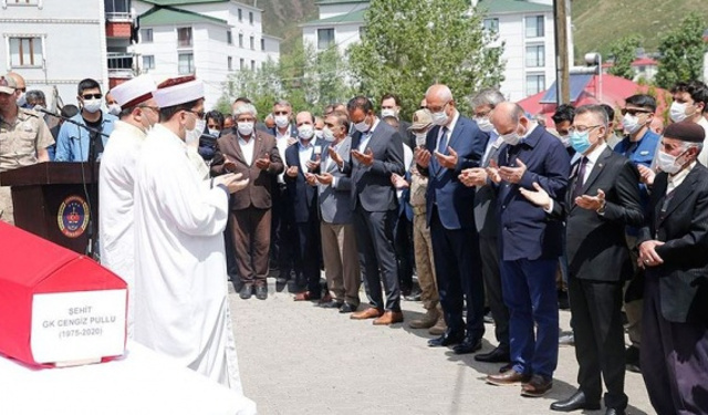 Şehidin çocukları Ayşenur, Rabia, Yusuf Samet ve Asiye Pullu ile akrabalarının ve yakınlarının bulunduğu defin sırasında, şehidin mezarı başında saygı atışı yapıldı.