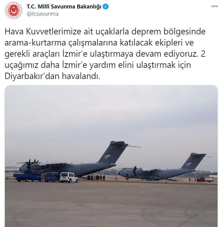 Yapılan paylaşımda; “Hava Kuvvetlerimize ait uçaklarla deprem bölgesinde arama-kurtarma çalışmalarına katılacak ekipleri ve gerekli araçları İzmir’e ulaştırmaya devam ediyoruz. 2 uçağımız daha İzmir’e yardım elini ulaştırmak için Diyarbakır’dan havalandı.” ifadelerine yer verildi.