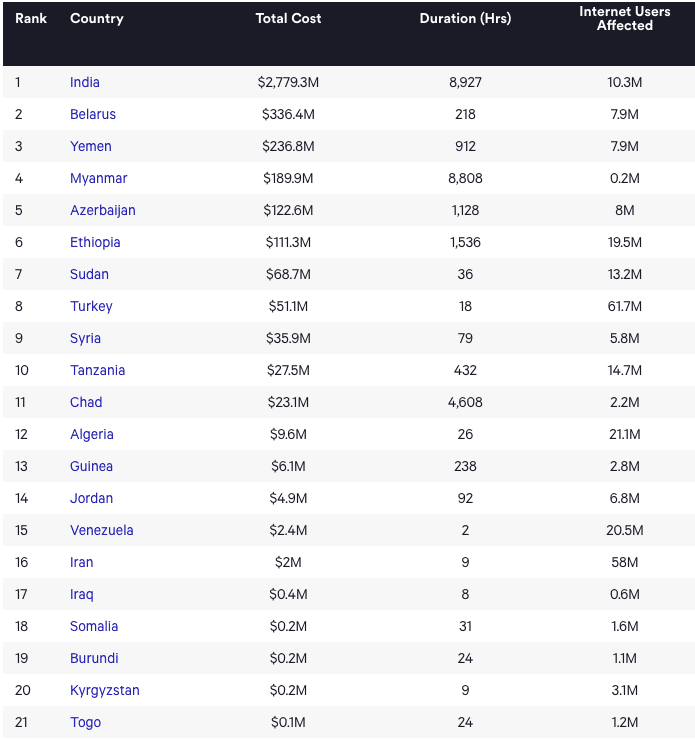 Hindistan’daki internet tıkanıklıklarını kontrol eden bir site olan internetshutdowns.in’e göre ülkede 2020’de internet 83 defa kapandı.Ağustos 2019 ile Mart 2020 arasında Cammu ve Keşmir’de yaşanan kesinti, grafikteki rakamların büyük olmasında önemli bir paya sahip. Ülke, 7 milyondan fazla insanın yaşadığı bölgedeki interneti Hindistan anayasasının 370. maddesini (Jammu ve Keşmir eyalet hükümetine bazı idari alanlarda özerklik sağlayan madde) Ağustos 2019’da kaldırdıktan sonra engelledi.
