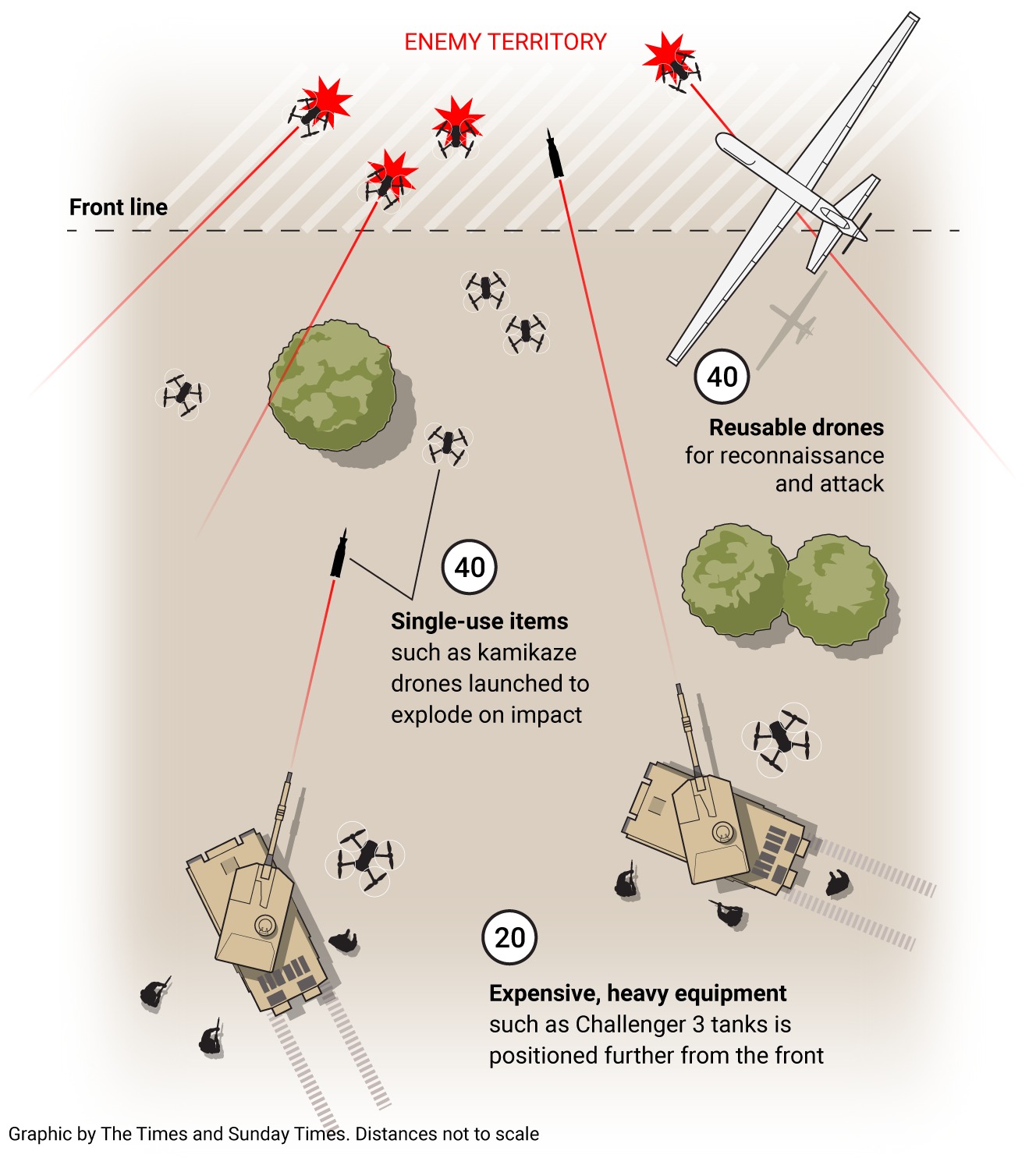 Stratejik savunma değerlendirmesi, “20-40-40” olarak bilinen ve asker kayıplarını azaltmayı amaçlayan yeni bir savaş yöntemi ortaya koyacak. Bu “özerklik hamlesi”, yaklaşık bir yıldır üzerinde çalışılan değerlendirmenin bir parçası olan yenilik planlarının merkezinde yer alıyor.