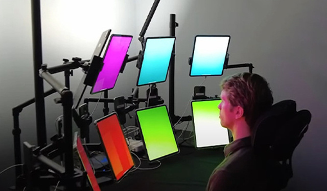İnsan yüzünü kaydeden yapay zeka mekanizması sekiz tablet ve yedi telefonla yarım daireyi andıran bir aydınlatma sisteminden oluşuyor.
