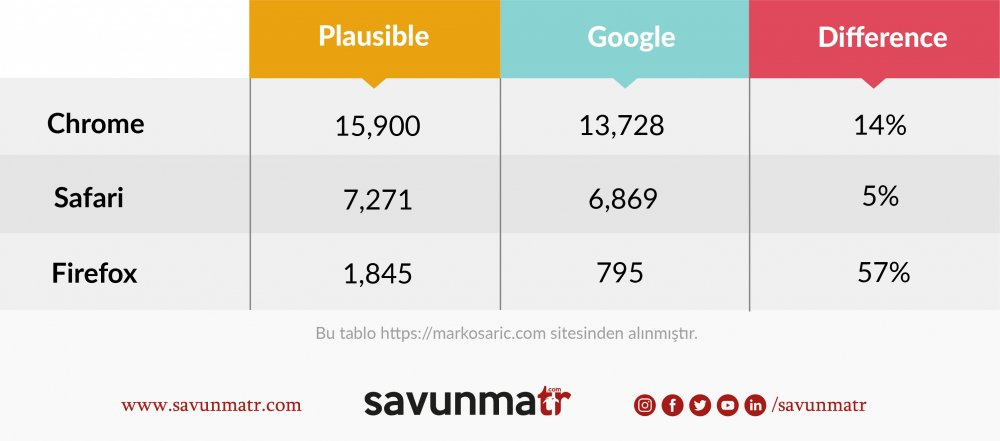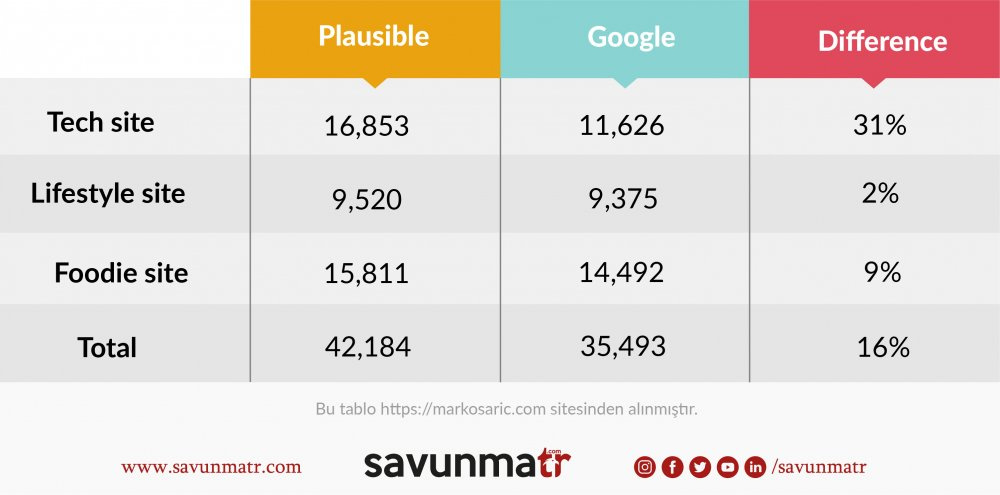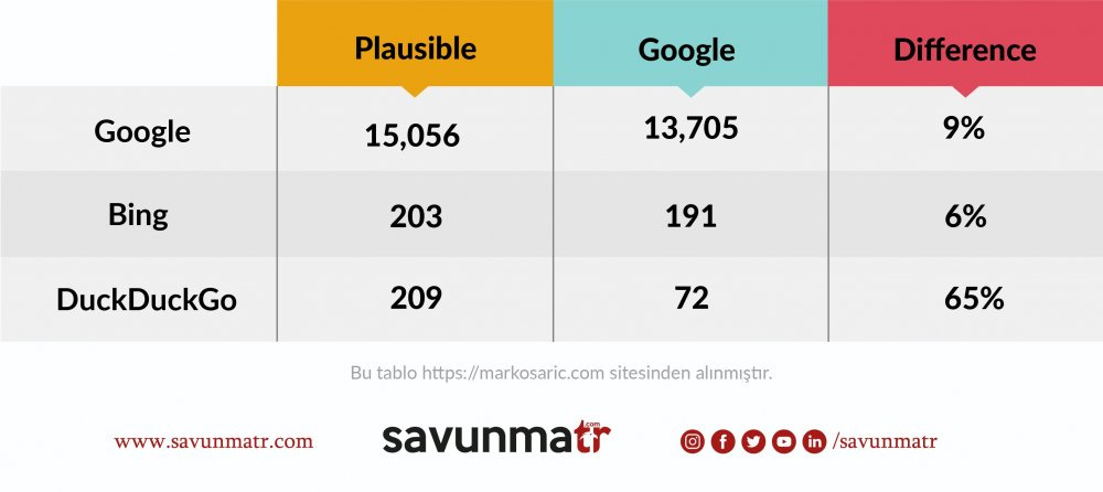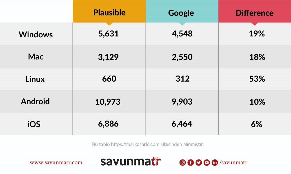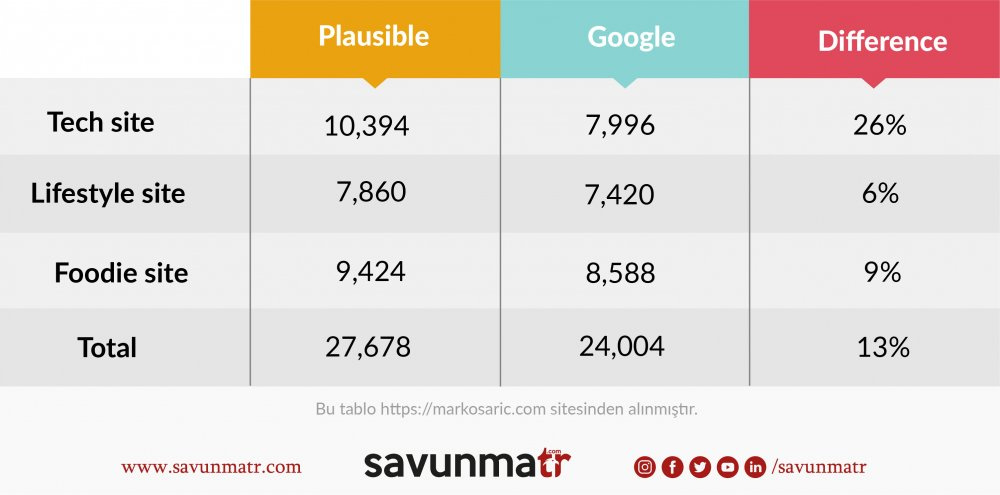 Burada iki istatistik sağlayıcısından gelen verilerin aynı paritelere ve kıstaslara sahip olma ihtimalinin az olduğunu belirtmek gerekir, zira Plausible Analytics ve Google Analytics’in farklı ölçüm yöntemleri vardır ve belirli metrikleri farklı tanımlanıyor.
