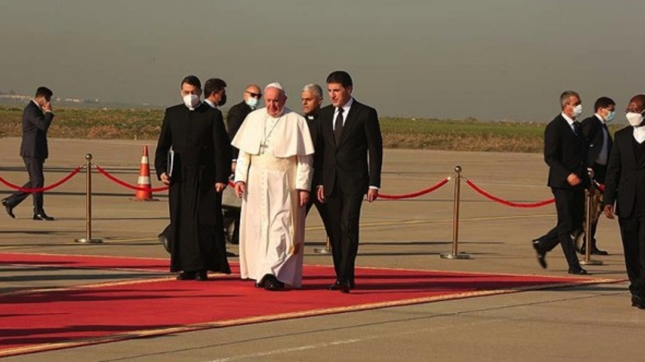 Papa Franciscus, havalimanında Irak Kürt Bölgesel Yönetimi (IKBY) Başkanı Neçirvan Barzani ve Başbakan Mesrur Barzani’nin yanı sıra bölgedeki dini ve hükümet yetkilileri tarafından resmi törenle karşılandı.