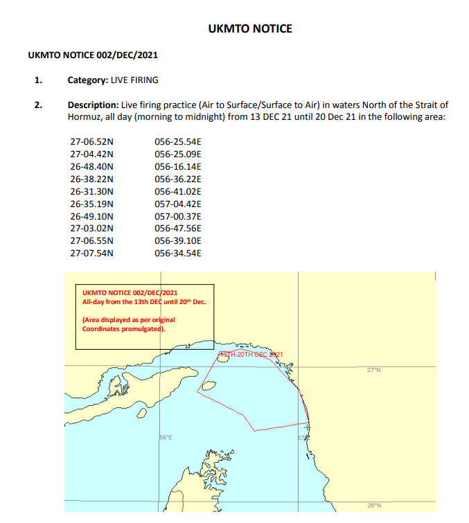 UKMTO’nun resmi açıklamasında, ”Canlı havadan karaya ve karadan havaya atış testeleri gerekçesi ile Hürmüz Boğazı’nın kuzeyi, 13-20 Aralık tarihleri arasında gün boyunca NATOM kapsamında olacaktır.” ifadeleri kullanıldı.