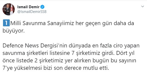 Cumhurbaşkanlığı Savunma Sanayii Başkanı Prof. Dr. İsmail Demir, konuyla ilgili sosyal medya hesabı Twitter’dan şu açıklamayı yaptı: “Milli Savunma Sanayiimiz her geçen gün daha da büyüyor. Defence News Dergisi’nin dünyada en fazla ciro yapan savunma şirketleri listesine 7 şirketimiz girdi. Dört yıl önce listede 2 şirketimiz yer alırken bugün bu sayının 7’ye yükselmesi bizi son derece mutlu etti. Listede yer alan şirketlerimizi tebrik ediyor, başarılarının devamını diliyorum. Hedefimiz bu listede daha fazla savunma şirketiyle yer almak.”