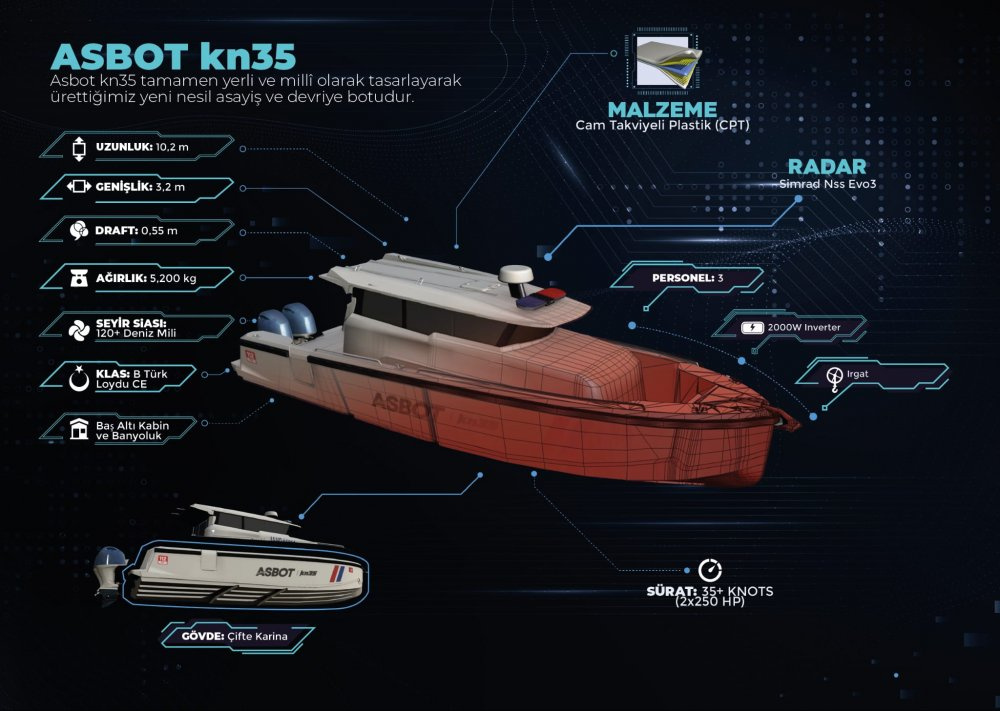 Jandarma’nın ihtiyaçları gözetilerek göl, akarsu ve denizlerde çalışabilecek şekilde dizayn edilen ASBOT, deniz durumu 4’e kadar görev yapabilirken 2 adet 250 beygir outboard motor ile 40 ‘knot’a kadar sürate de de sahiptir.