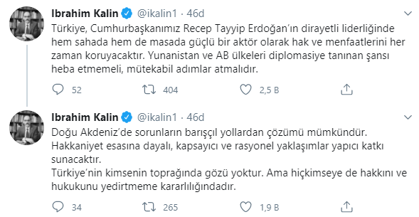 Cumhurbaşkanlığı Sözcüsü İbrahim Kalın, Twitter hesabından yaptığı paylaşımda, Yunanistan ve AB ülkelerinin diplomasiye tanınan şansı heba etmemesi ve mütekabil adımlar atmaları gerektiğini belirtti.