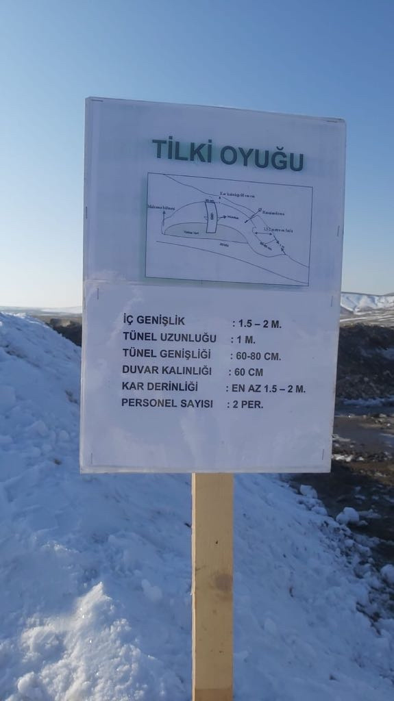 2 personel ile inşa edilen “tilki oyunu”nun yapımı ise 4 saati bulur.  Yığılan karların içi önce tünel şeklinde 1.5 oyulur. Daha sonra kubbe şeklinde içerisi genişletilir. Rüzgar altı yamaçlarda kar derinliği 1.5 olan yerlerde yapılır.