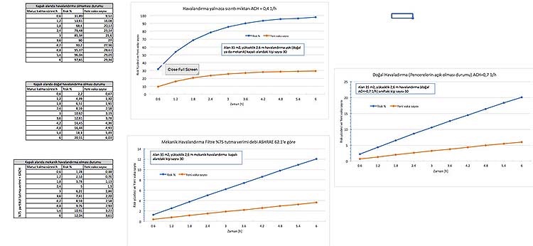 Havalandırması olmayan 35 metrekarelik alana ve 2,6 yüksekliğe sahip bir kapalı alanda 30 kişinin 1 saat boyunca bir arada olması ve 1 kişinin bulaştırıcı olması halinde bulaş riski yüzde 47 olarak hesaplanırken, bu sürenin sonunda 14 yeni vakanın olacağı öngörüldü. Doğal havalandırma yani mekandaki pencerelerin açık olması halinde aynı koşullarda risk yüzde 30 olarak hesaplanarak, 1 saat sonra 9 yeni vakanın olabileceği tahmin edildi. Mekanik havalandırma durumunda ise aynı koşullarda risk yüzde 2’ye düşüp, yeni vaka sayısı ise 0,6 olarak hesaplandı.”