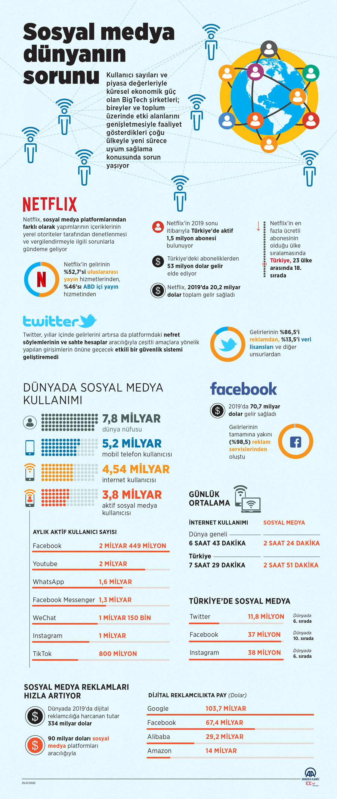 İngiltere merkezli We Are Social sitesinde yayımlanan “Digital 2020” raporu verilerine göre 7,8 milyara ulaşan dünya nüfusunun 5 milyar 190 milyonu mobil telefon kullanıcısı, 4 milyar 540 milyonu internet kullanıcısı ve 3 milyar 800 milyonu aktif sosyal medya kullanıcısı konumunda bulunuyor.