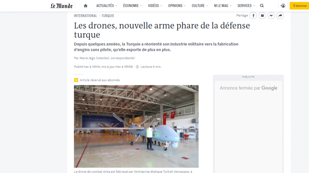 Le Monde’un haberinde, Türkiye’nin son yıllarda savunma sanayiini insansız hava aracı üretmeye yönelttiği ve ihracatını gün geçtikçe artırdığı ifade edildi.